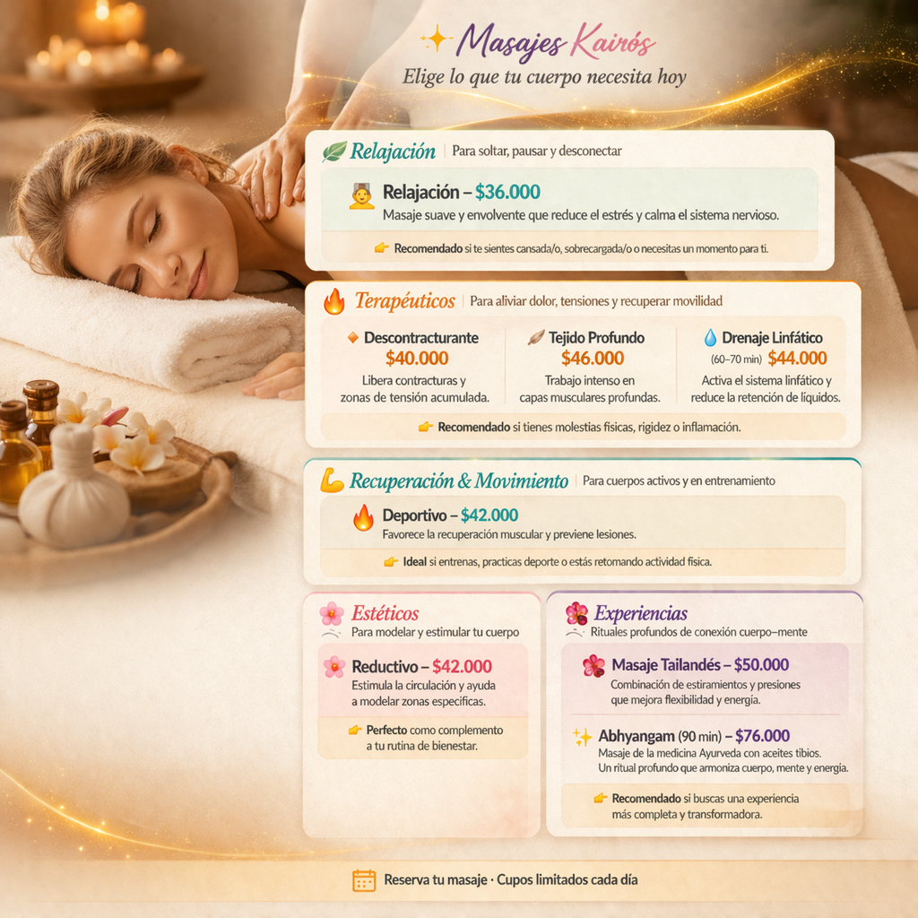 Cada masaje está diseñado para responder a lo que tu cuerpo necesita hoy: relajar, liberar tensiones o recuperar energía.