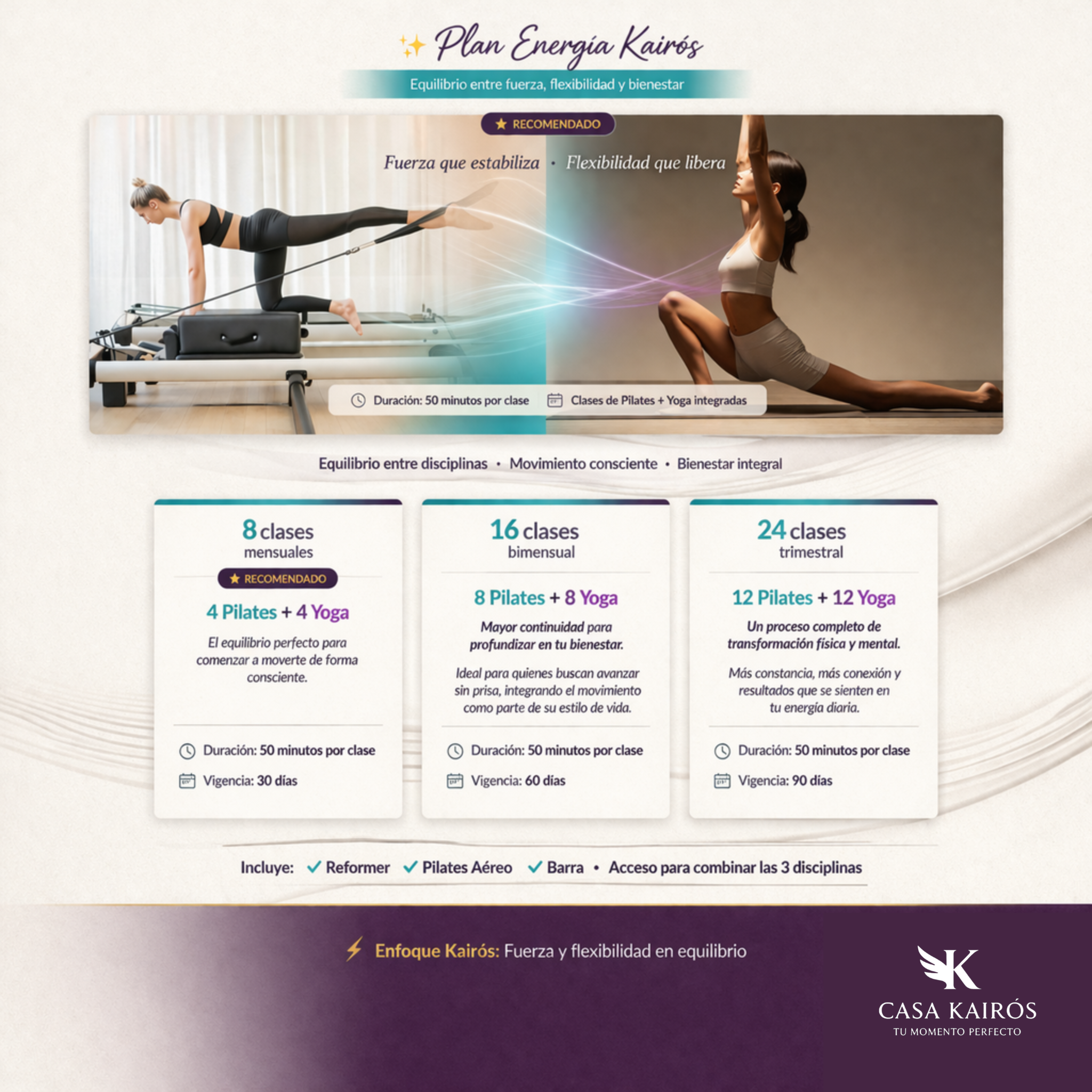 El Plan Energía de Casa Kairós combina de forma equilibrada Pilates y Yoga, creando un programa integral diseñado para fortalecer tu cuerpo, mejorar tu movilidad y ayudarte a reconectar contigo.